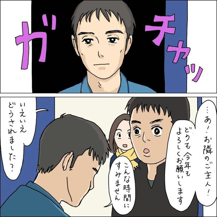 イラストレーターとして活躍しつつ3姉妹を育てるMichika(@michika_haha)さんは、夫と結婚して迎えた初めてのお正月にある体験をします。義実家への帰省から自宅に戻ると、正月の夜にも関わらず隣に住んでいる男性が訪問。いきなりの行動にびっくりしていると、「お見せしたいものがある」と言って、あるものを渡されるのですが…。Michikaさんの身に、何が起こったのでしょうか?「犯人の目的は?」第1話です。