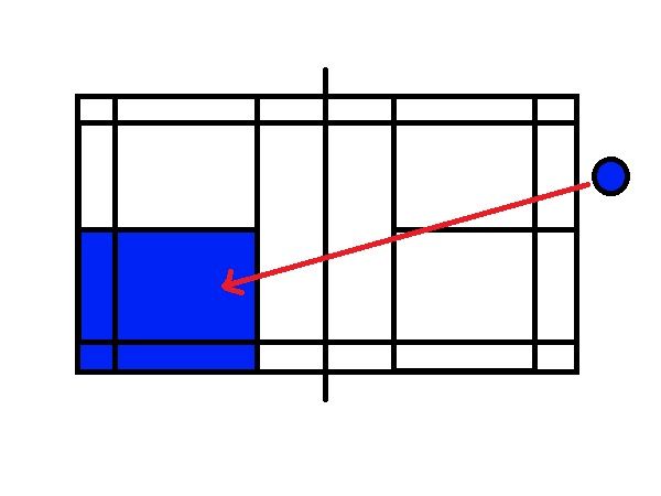 サーブはアンダーサーブで、上の図のように対角線上のサービスゾーンに打ちます。 サーバーはレシーブが返ってきたら、必ずワンバウンドしてから返球しなければなりません(ツーバウンドルール)。