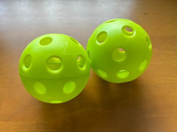 アメリカの起業家や俳優などの有名人もハマっていることで一躍脚光を浴びたピックルボール。 パドルと呼ばれるラケットで、穴が空いた一風変わったボールを打ち合うスポーツです。 ボールを触ってみると、プラスチック製で弾力はありません。 穴が空いていることによって風の抵抗を受けやすく、球速が弱まるため、老若男女問わず誰でもラリーが楽しめるそうです。 ピックルボールはテニスとバドミントンと卓球の要素を組み合わせたものと言われているだけあって、ラケットスポーツ経験者は慣れるのが早いとのこと。