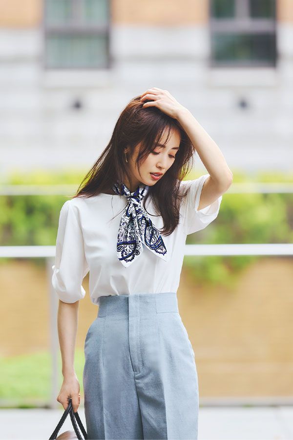 3. シンプルカットソーはスカーフをONしてアイキャッチに!〈7/10のコーデ〉