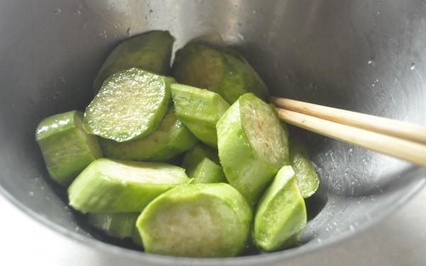 白ナスを調理する際、包丁で切って放置しておくと変色しやすいので注意。変色を防ぐには、切ったらすぐに塩水につけて5分ほど置いておくといいでしょう。