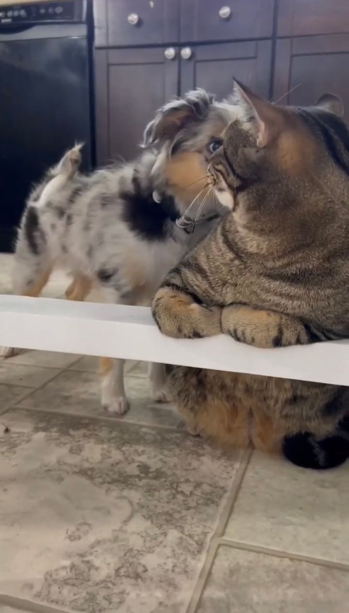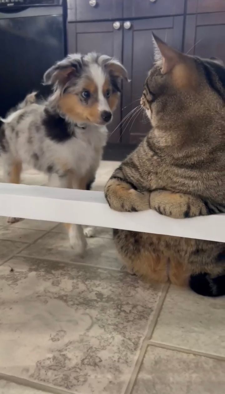 3. 肩トントンからのキス!?新しくやってきた子犬から先住ネコにかわいい「はじめまして」のご挨拶!!【海外・動画】
