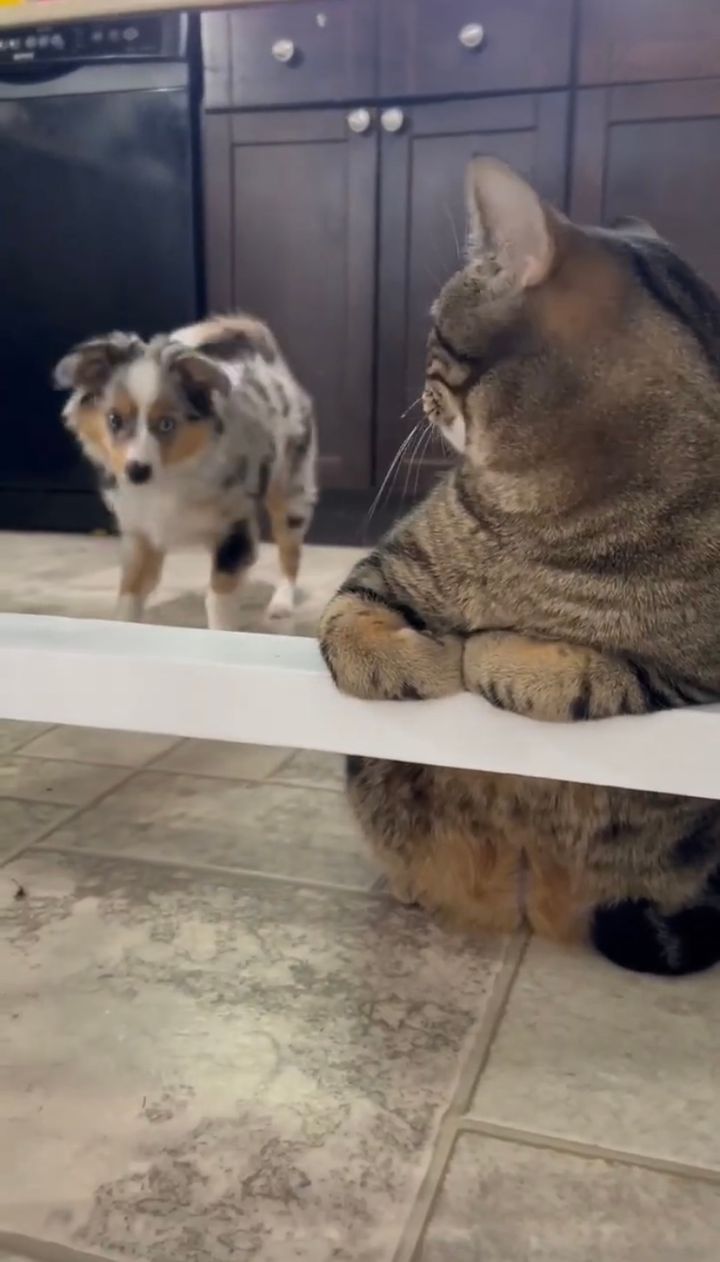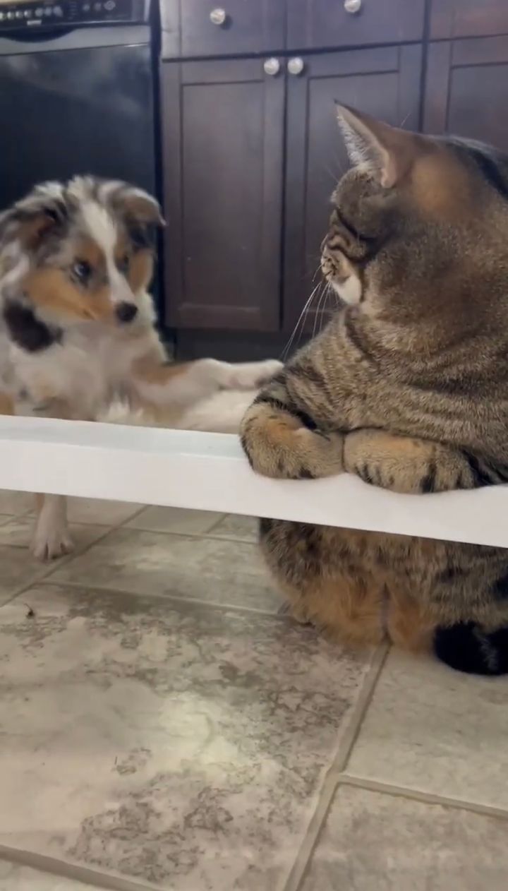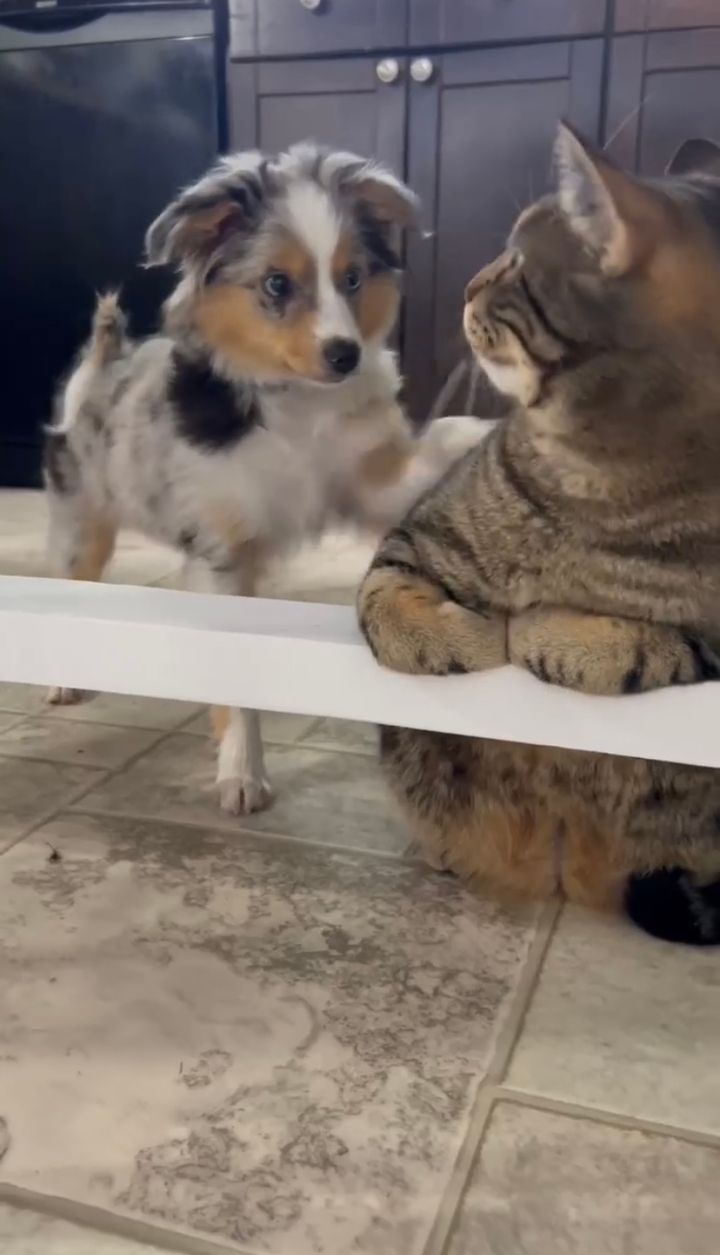 先住ネコと初めて顔を合わせた子犬。 この子は、いきなりかわいい「はじめまして」の挨拶を披露して驚かせました!