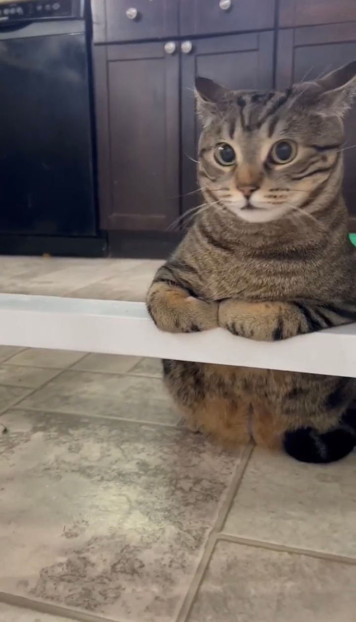 そんなかわいい「はじめまして」の挨拶をされたネコは・・・、とても驚いたみたいです。 飼い主さんの方を振り向いた時に見せた表情がまた秀逸です。