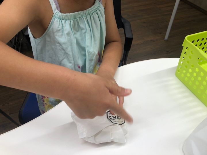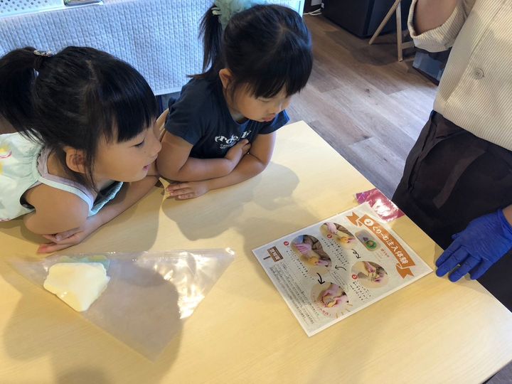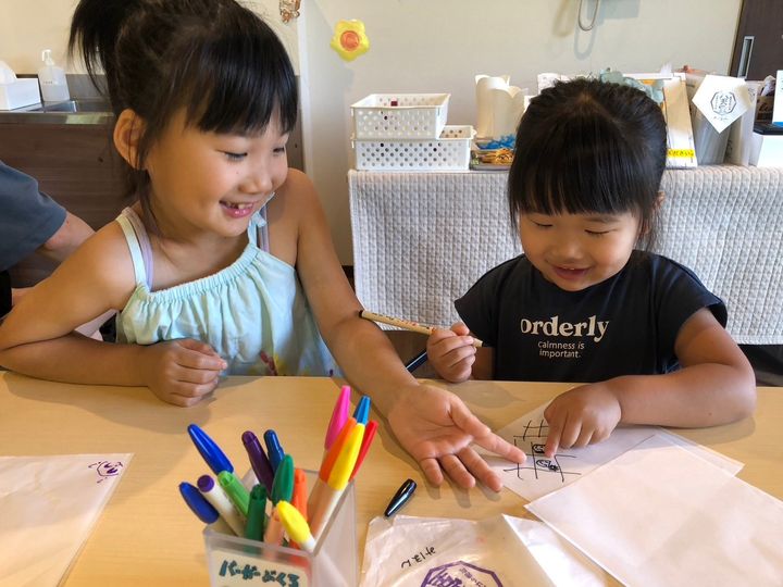 自分で好きなイラストを描いたオリジナル包装紙で包んだら完成です。こちらの体験は30分弱で終了しました。7歳長女は基本的に1人で、4歳次女はところどころサポートしながらも楽しみながら体験することができました。