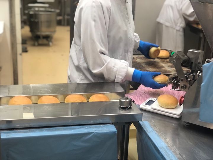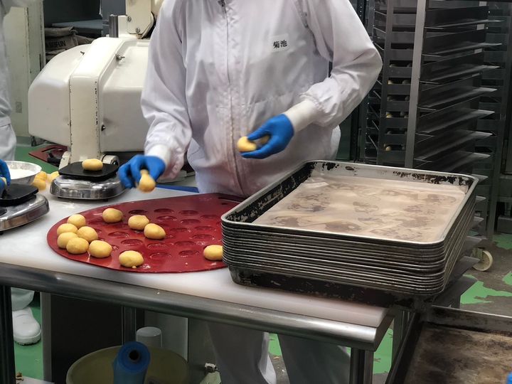 一番奥はパン生地を作る工程です。機械で小さく丸められた生地を天板に乗せて焼いていきます。製造は、昼過ぎに終わってしまうことが多いらしいので13時くらいまでの訪問がおすすめです。