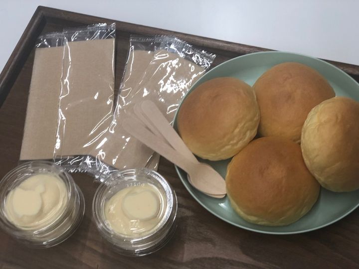工場で焼きたてのパンとクリームです。八天堂のパンは時間を置いてしっとりさせていますが、こちらは焼き立てなのでまだ温かく、パンだけでも甘くておいしい!まさに工場ならではの体験ですね!