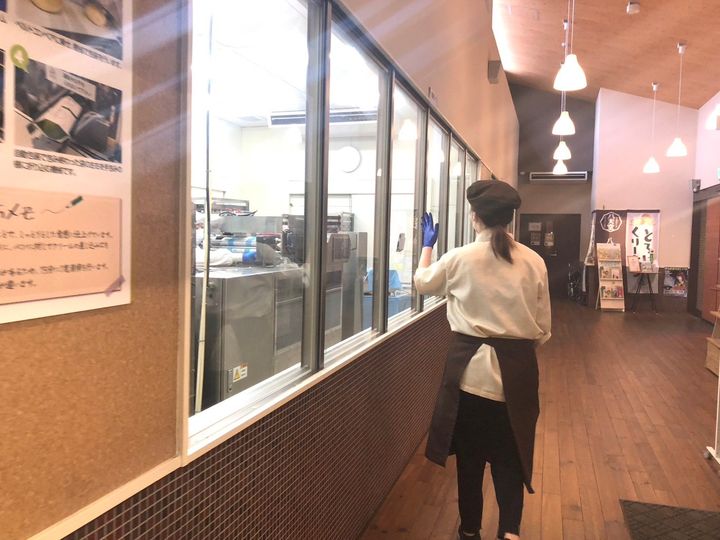 そんな八天堂ですが、今回紹介するのは、2023年4月にグランドオープンした「八天堂カフェリエきさらづ」。ここでは、予約不要・自由見学でガラス越しに工場見学が楽しめるほか、事前予約をすれば、VR工場見学やパンづくり体験もできるんです。
