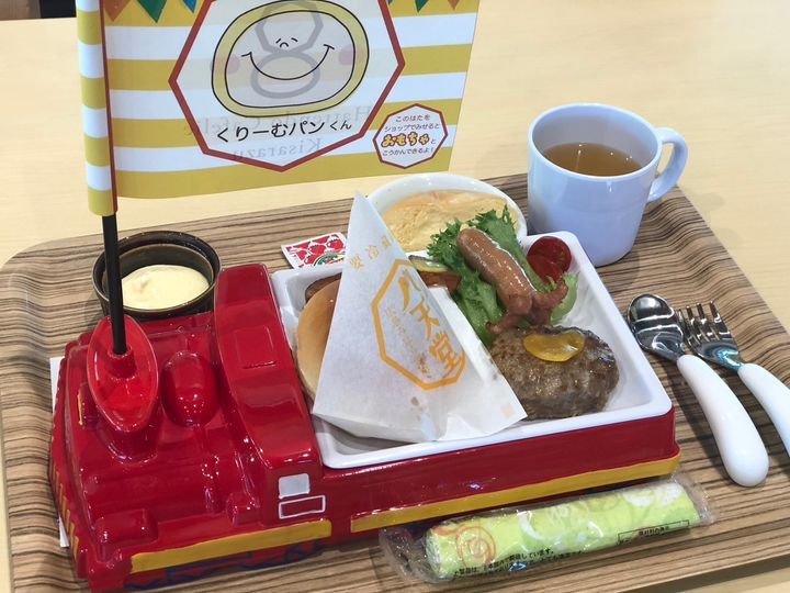 お子さまランチはくりーむパンのパンを使って自分で作るハンバーガースタイルになっていました。食べ終わったあとに旗をもっていくとおもちゃと交換してくれるシステムは、親としては先に渡されるより助かります(笑)。大人用も子ども用もクリームがついてきましたが、甘さ控えめでプリンみたいでおいしかったです。