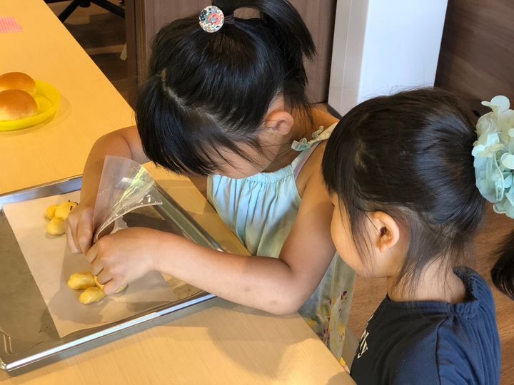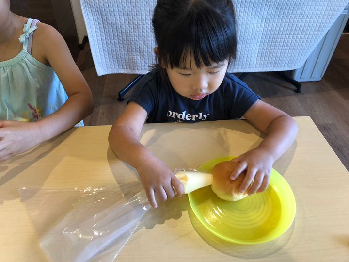 生地をスタッフが焼いてくれている間に、2つ目の体験であるパンのクリームを詰めを行います。(クリームは好きな味を選択可能)なかなか力加減が難しいですが、パンが柔らかいのですーっと入っていきます。