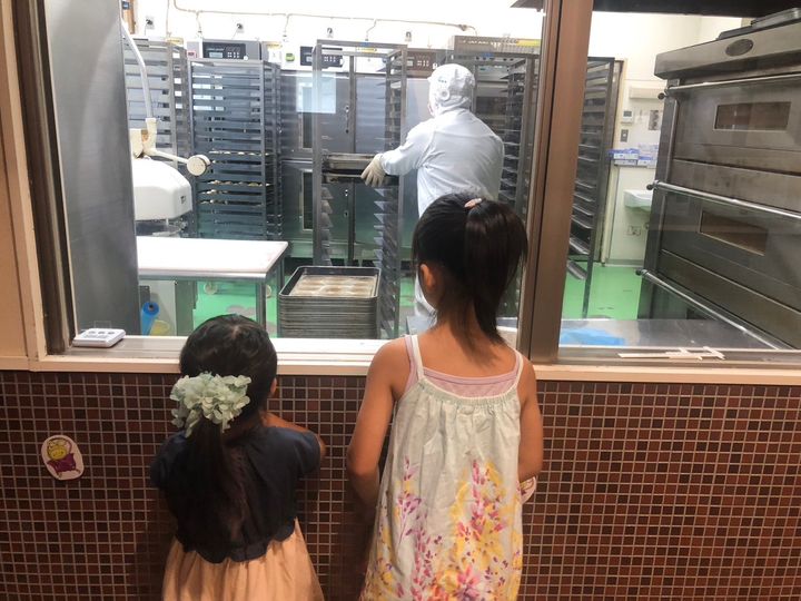 つぎつぎにクリームが詰められ、コンベアに流されていくくりーむパンがとってもかわいい!商品の切り替えも多いので、いろんなパッケージでの包装工程が楽しめるところもポイントです。