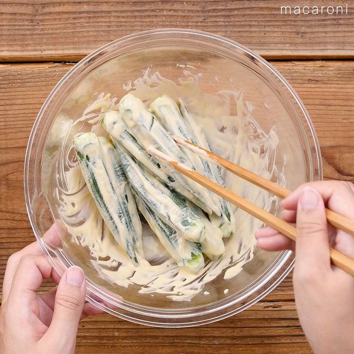 2: ボウルにマヨネーズ、めんつゆを入れて混ぜ合わせたら、オクラを加えて和えます。