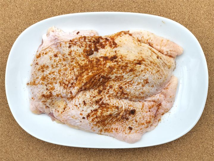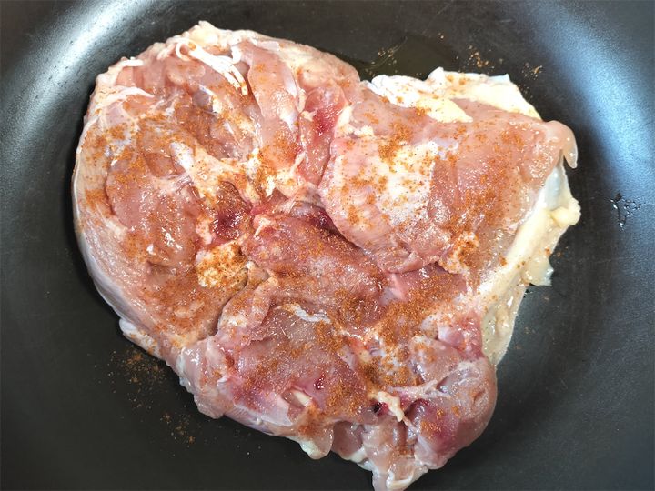2. 鶏肉の皮面全体をフォークで何か所も突き刺し、塩、カイエンペッパーを両側に振ります。