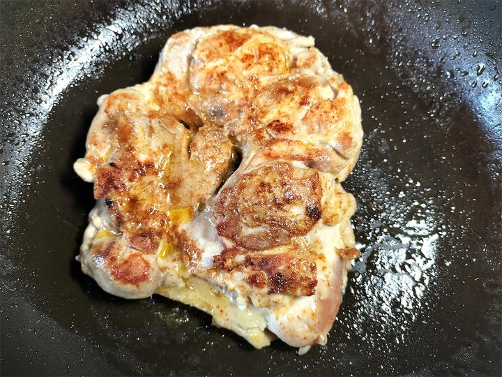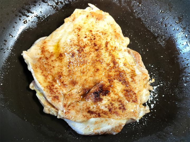 4. 時々裏返しながら皮面がこんがり焼けたら、フライパンのオリーブオイルをスプーンですくって皮面にかけます。