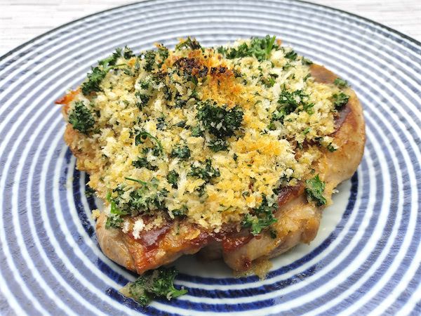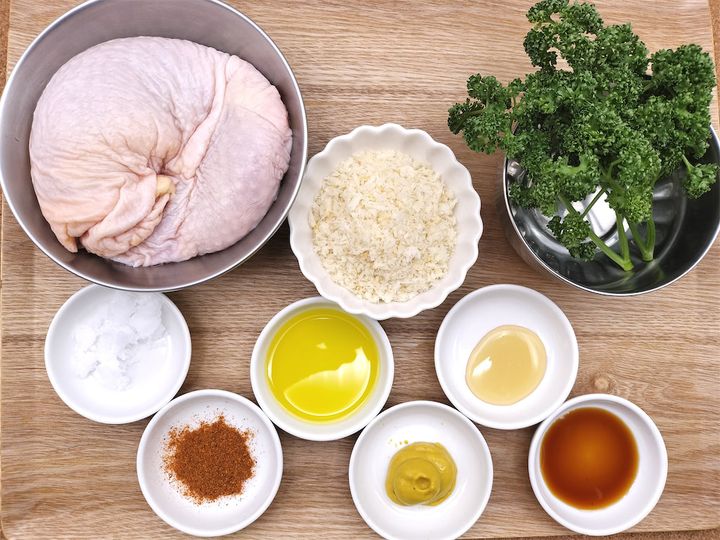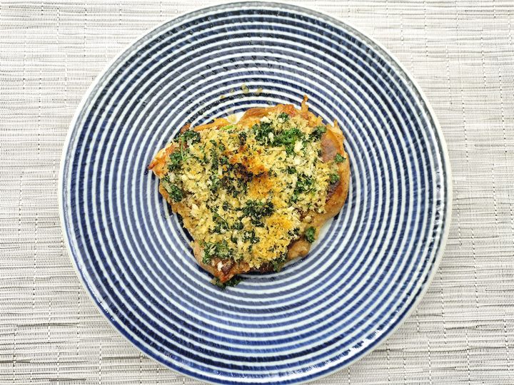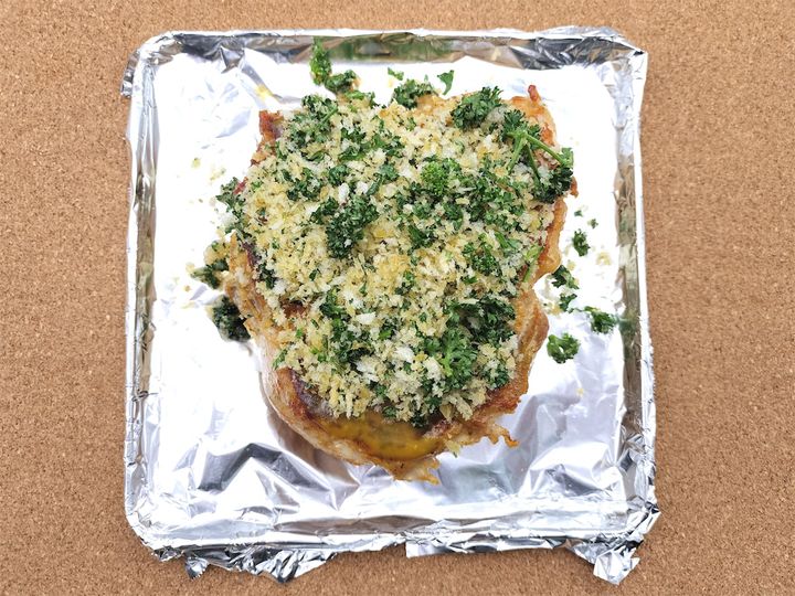 8. 取り出しておいた肉の皮面全体にマスタードのソースを塗り、その上にパン粉とパセリを混ぜたものを全体に乗せます。トレイごとトースターに入れて強火で30秒程度、パン粉の上がちょっと焦げ目がつく程度に焼きます。