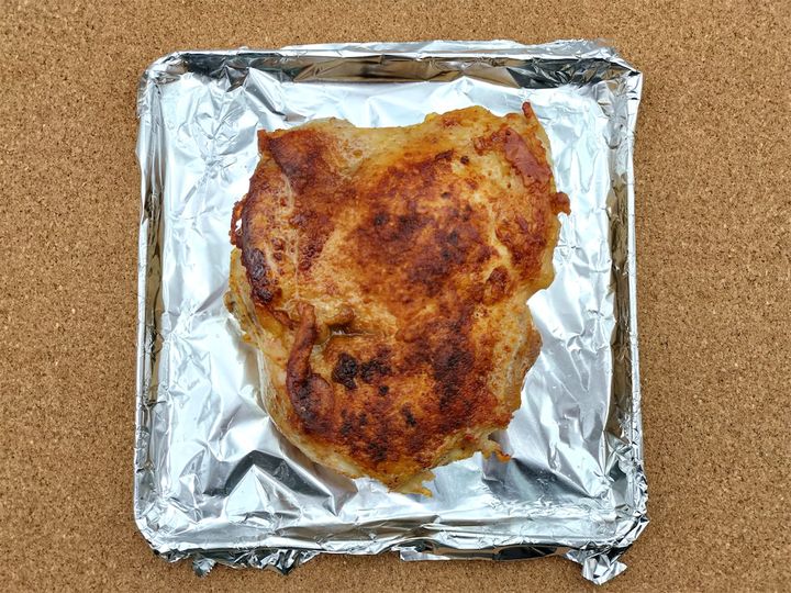 6. 火を止めて肉を取り出し、トースターのトレイに置きます。