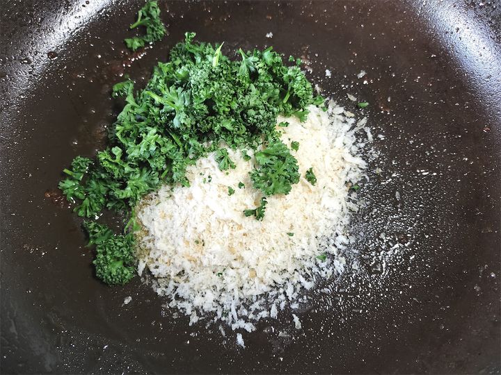 7. オリーブオイルの残ったフライパンにパン粉とパセリを入れて、オイルを吸わせるように混ぜ合わせます。
