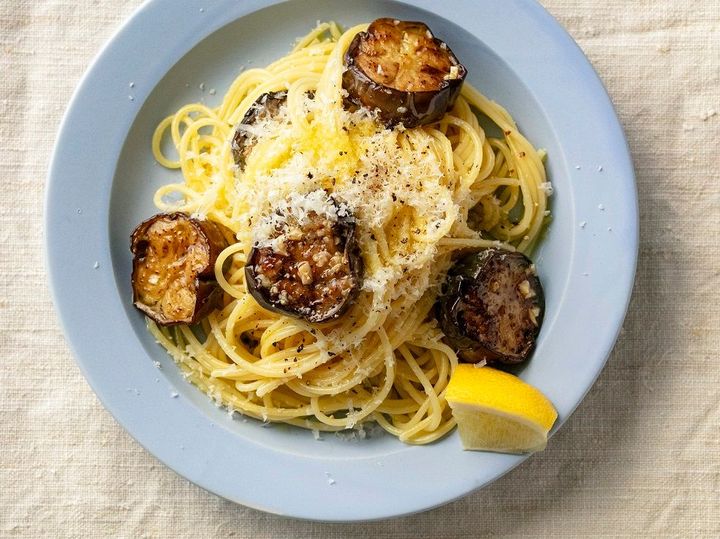 ゆでたパスタになすとオイルを加えてあえ、パルメザンチーズをたっぷりと削る。レモンを絞ればさっぱりおいしい!