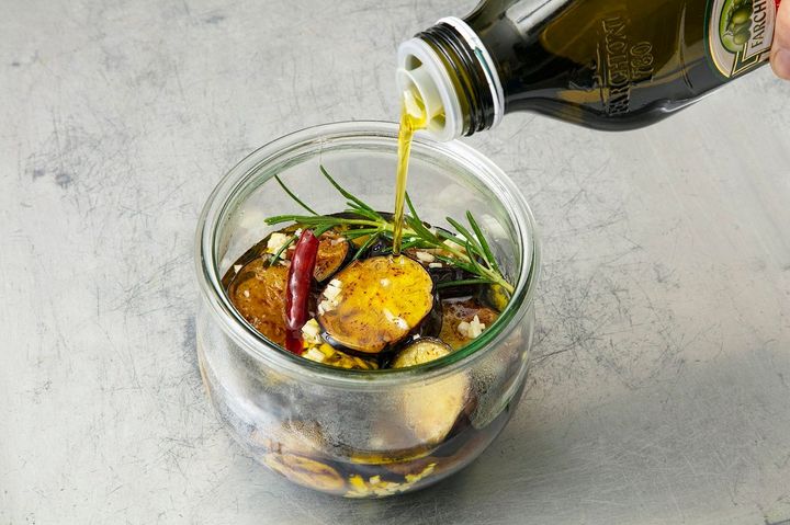 (3)清潔な耐熱の保存容器に焼いたなす、にんにく、好みで赤唐辛子、ローズマリーを入れ、フライパンに残ったオイルを加えたら、さらにオリーブオイルをひたひたになるまで注ぐ。さめたらふたをする。