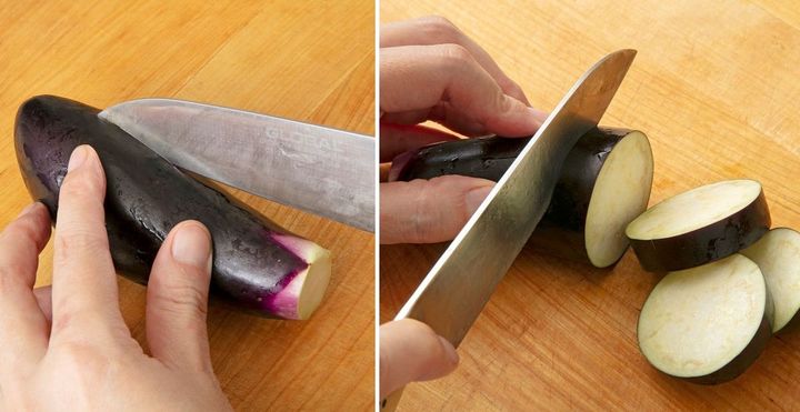 (1)なすはへたを切り落とし、皮に縦にぐるりと一周切り込みを入れる。幅1㎝ほどの輪切りにする。にんにくはみじん切りにする。