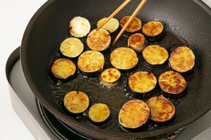 (2)フライパンにオリーブオイルを高さ1~1.5㎝ほど入れて中火にかけ、なすを揚げ焼きにする。なすがオイルを吸いきったらオイルを適宜追加する。両面に焼き色がつき、くったりとしたら火を止め、塩をふる。