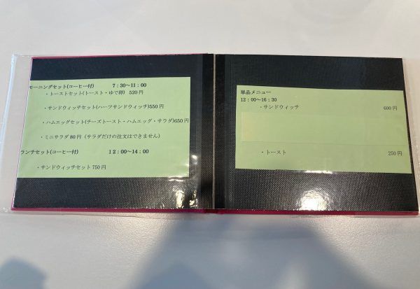 モーニングは3種類。 トーストとゆで卵、サンドイッチ、ボリュームたっぷりのチーズトーストにサラダとハムエッグがついたもの。 すべて珈琲つき。しかも珈琲はメニューに載っている銘柄なら追加料金なしで選ぶことができます。 2杯目の珈琲は250円で飲めるのでゆっくり過ごしたい方にはお得!!