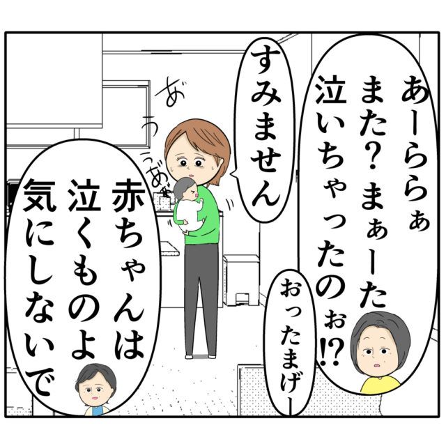 やば美さんに責めるような口調で言われ、ほの香ちゃんをあやしながら思わず謝るすみれさん。