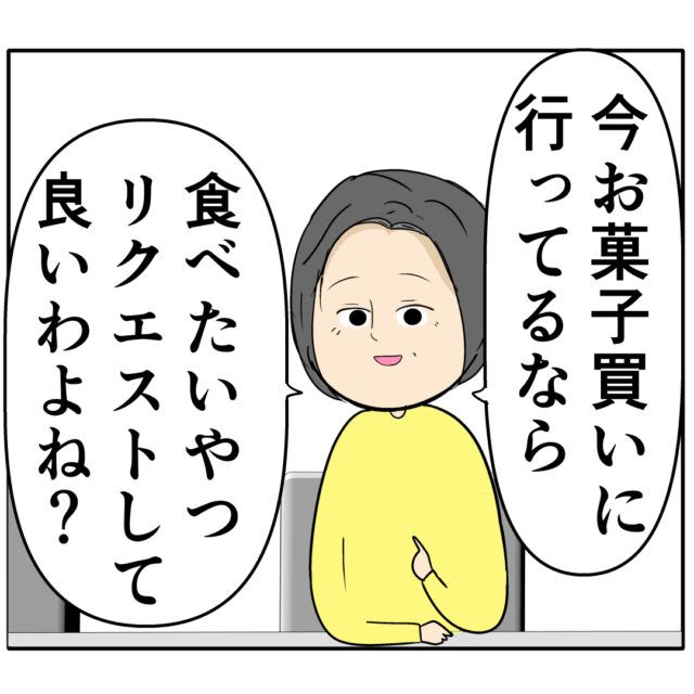 「今お菓子買いに行ってるなら、食べたいやつリクエストして良いわよね?」
