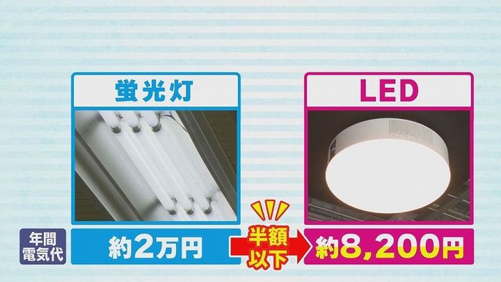 しかも、蛍光灯の場合は消費電力が一年間で大体2万円位かかりますが、このアラジンのLEDに変えると、年間で8200円位。 半額以下にまで照明代が落ちると藤山さんは言います。