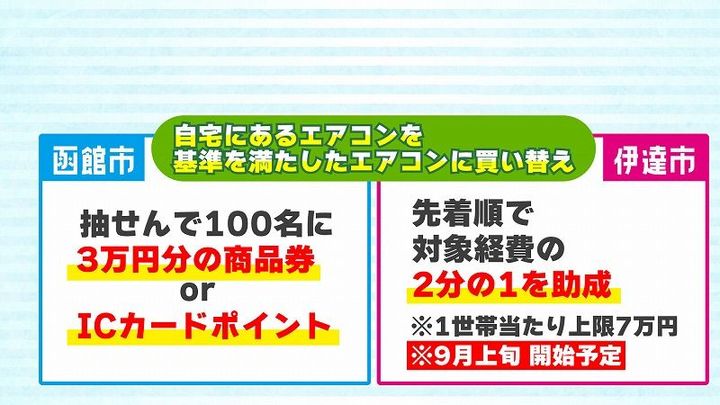 函館市では”省エネ家電買い換えキャンペーン”と題して省エネ性能などの基準をクリアしたエアコンなどを買い換えれば、抽選で100人に3万円分の商品券か交通系ICのポイントを進呈!