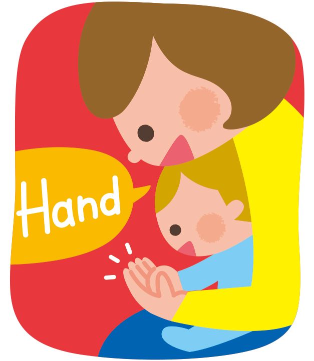 子どもをひざの上に座らせて、手を握りながら“Hand”と言ってみたり、“Head”と言って頭をやさしくポンポンとたたいたりしてみましょう。お互いのこぶしをじゃがいもに見立てて重ねながら“One Potato, Two Potatoes”と歌う手遊び歌で数に親しむのもおすすめです。