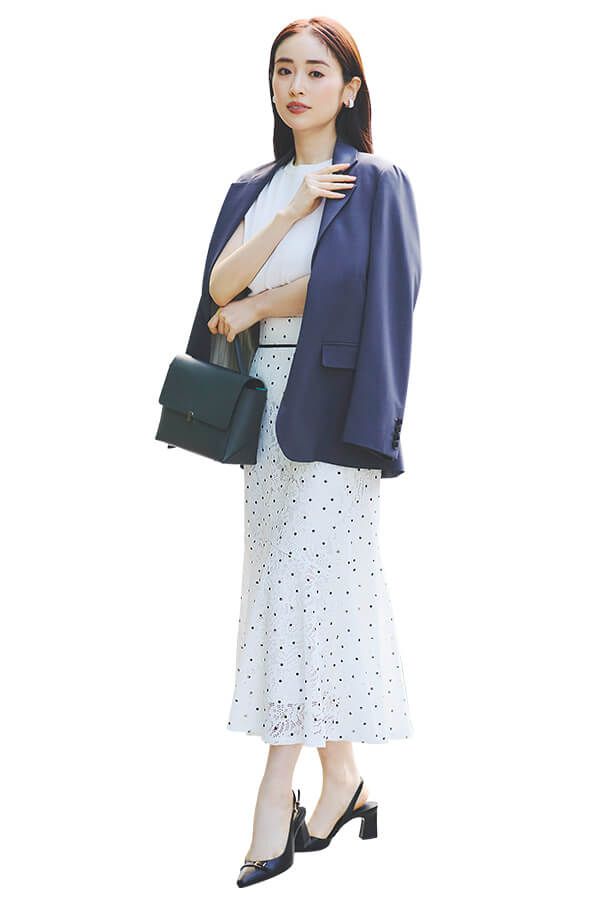 【ドットスカート】を通勤仕様に!白地ベース&ジャケット肩掛けでほどよく甘く上品に