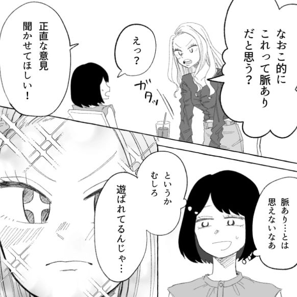 脈ありかどうか「正直な意見を聞かせて!」という彼女に対して、主人公はためらいつつも正直に答えます。しかし、その後大変なことになり……。