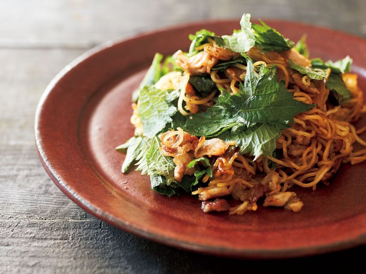 具は潔く大葉のみ。『青じそ香るカリカリ豚バラ焼きそば』のレシピ【大葉20枚大量消費】