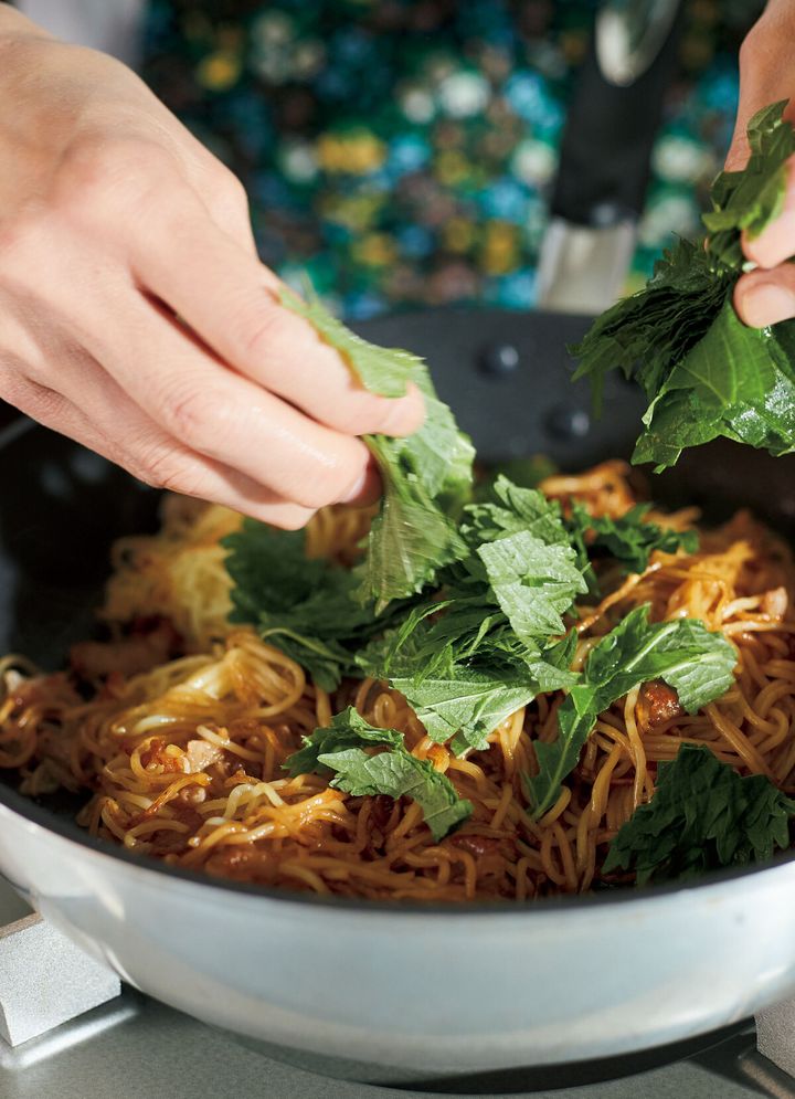 3. 具は潔く大葉のみ。『青じそ香るカリカリ豚バラ焼きそば』のレシピ【大葉20枚大量消費】