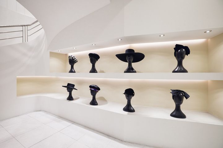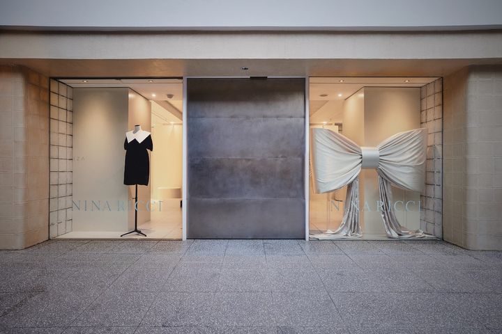 IZAの店頭はクリーム色のリボンでデコレーションされ、ニナ リッチの世界観をたっぷり堪能できる空間になっている。ハリス・リードの遊び心あふれるドラマチックなコレクションをお見逃しなく。