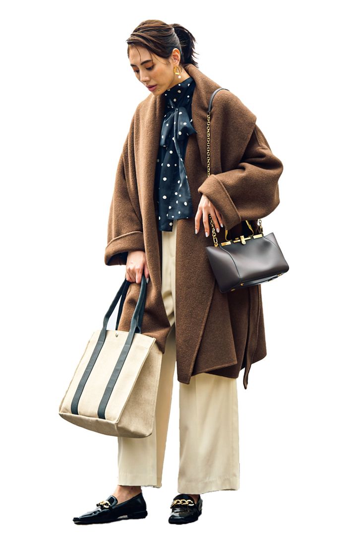 コート¥102,300(スタニングルアー/スタニングルアー 新宿店)ブラウス¥25,300(エーケーワン/デミルクス ビームス 新宿)パンツ¥29,700(マルティニーク/マルティニーク ルミネ横浜)ショルダーバッグ¥184,800(ザンケッティ/アルアバイル)トートバッグ¥36,300(フランソワ レニエ/ヤマニ)ローファー¥12,650(ル タロン/ル タロン 有楽町マルイ店)ピアス¥4,400(アビステ)