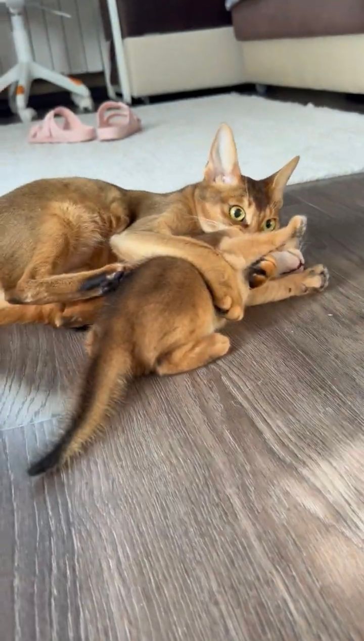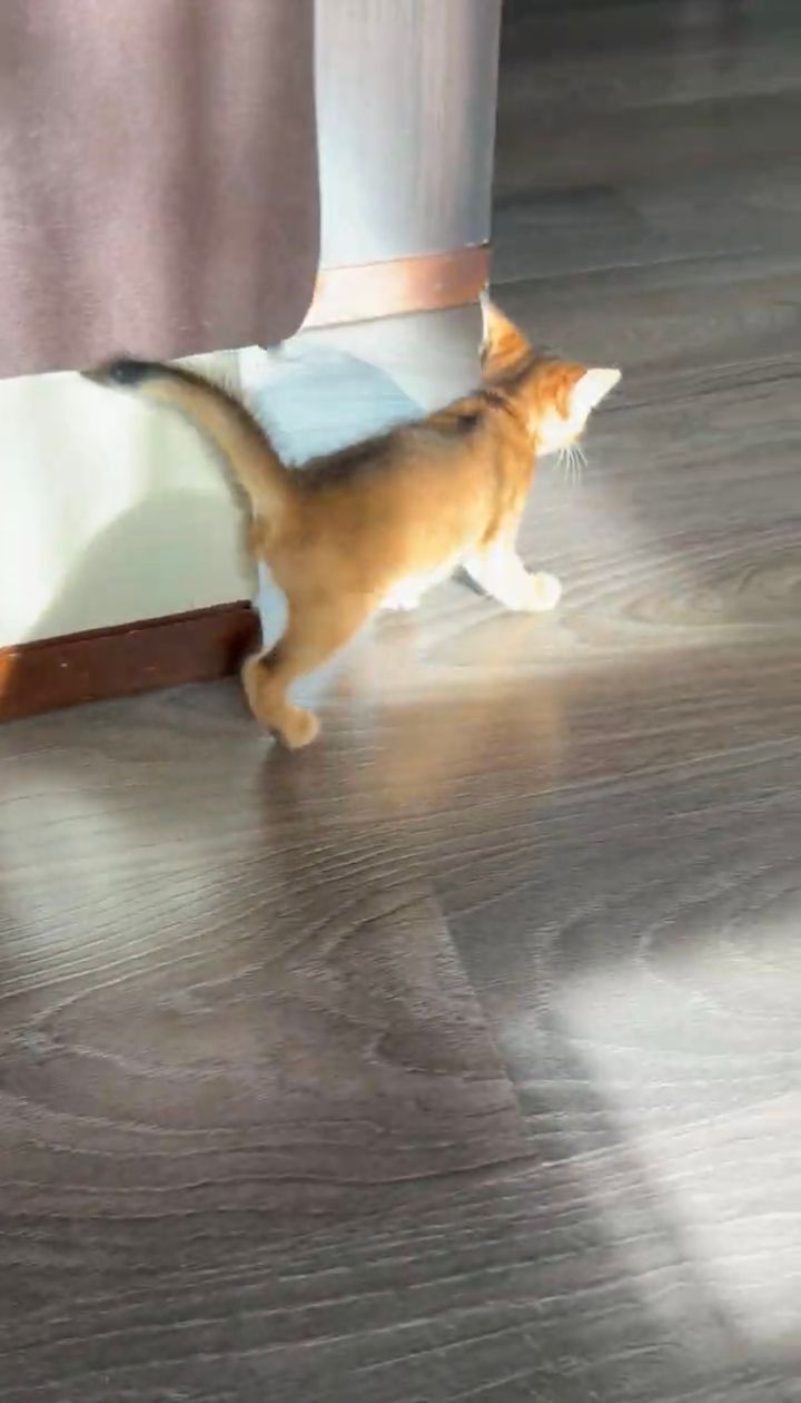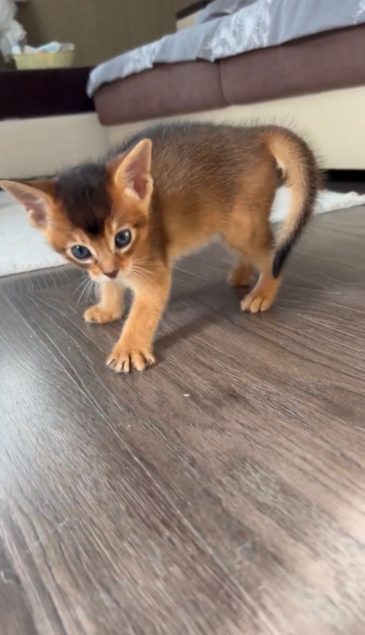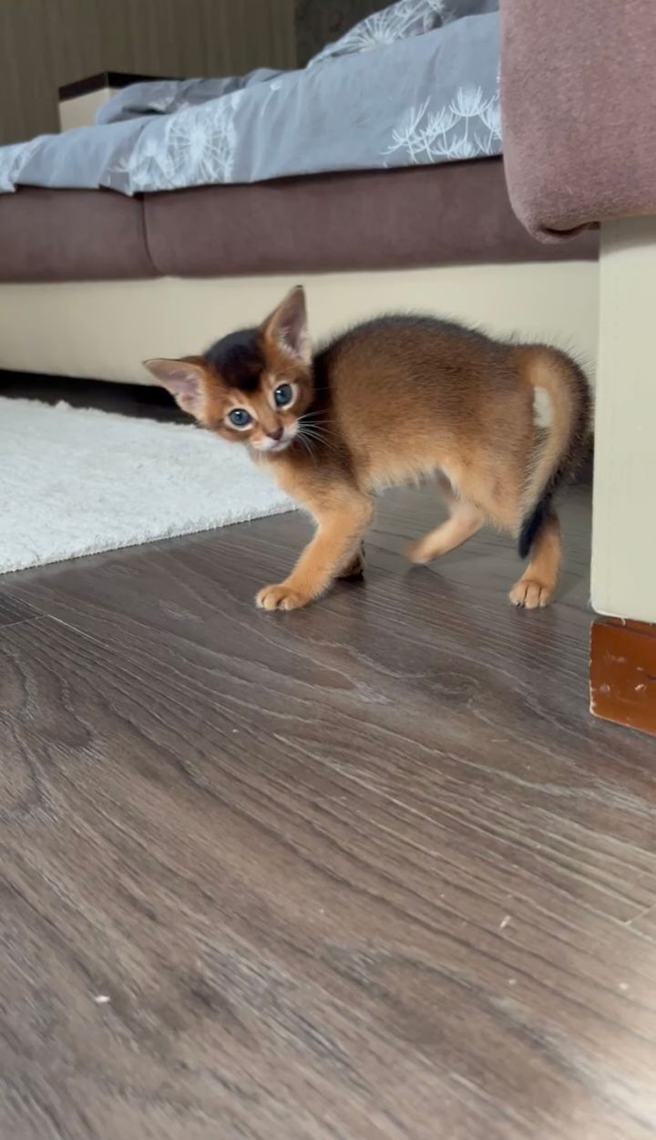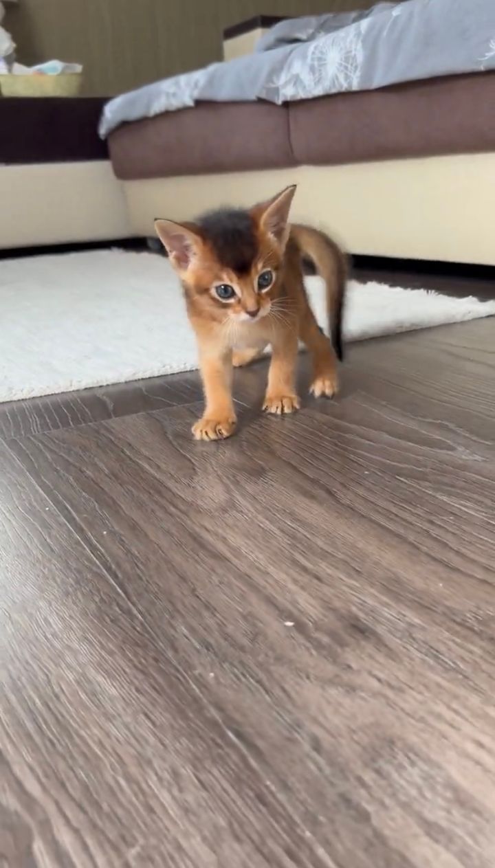 飼い主さんの視線やカメラの存在に気付いた様子の子猫。 この子は、スラっとした足を持つアビシニアンという品種の猫です。