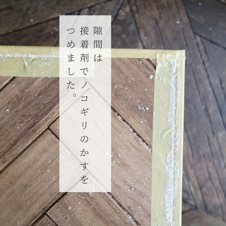 表に返し、周りを角材でふちどります。接着剤をたっぷり塗るのがコツです。すのことの間にすき間ができてしまったときは、接着剤とノコギリのかすを詰めて埋めると◎。