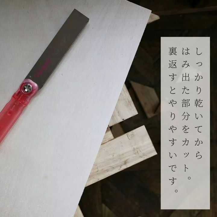 接着剤がしっかりと乾いたことを確認してから、はみ出た木材をカットします。裏返して合板に沿うようにノコギリで切りましょう。けがに気を付けてくださいね。