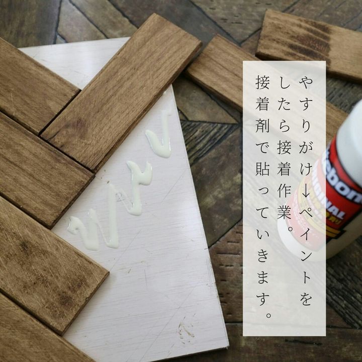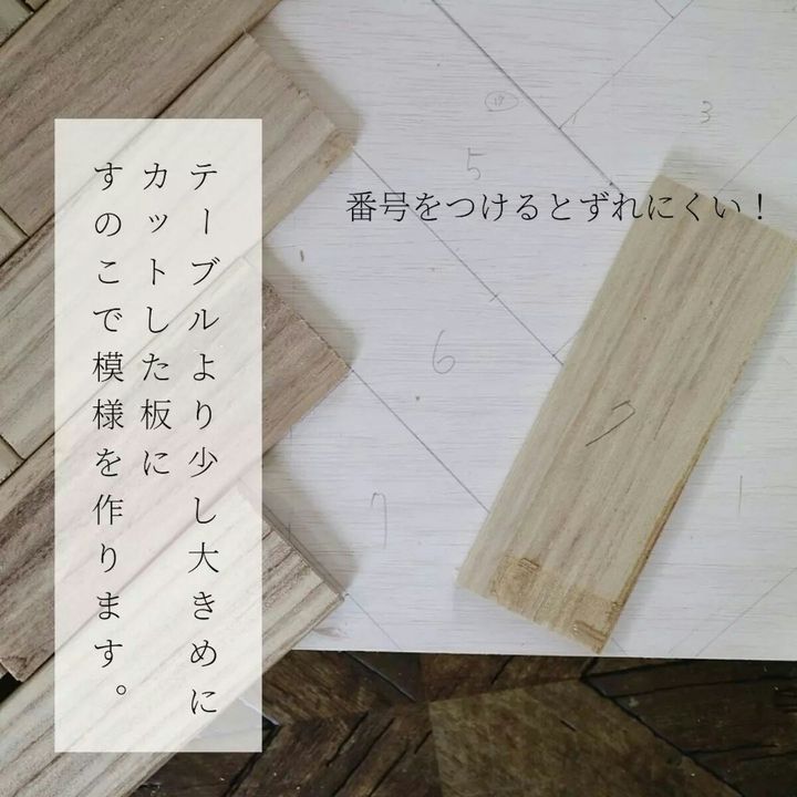 テーブルよりも、少しだけ大きくカットした板をベースにします。画像のように並べて模様を作りましょう。模様が作れたら、同じ順番で接着できるよう、板とすのこの両方に番号を書いておくと◎。