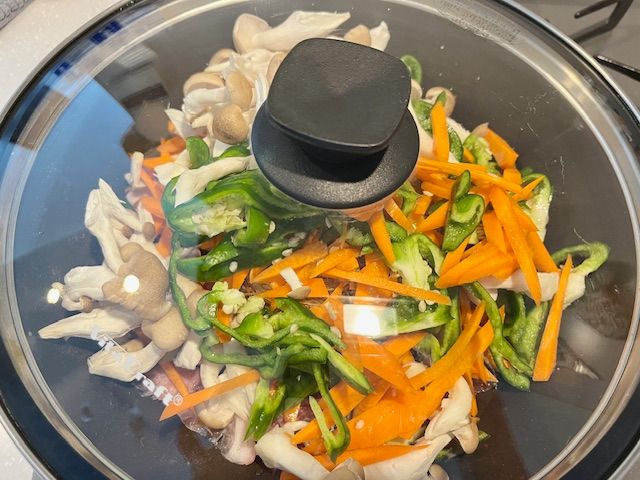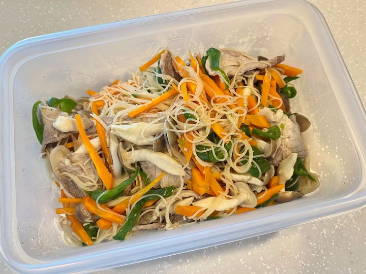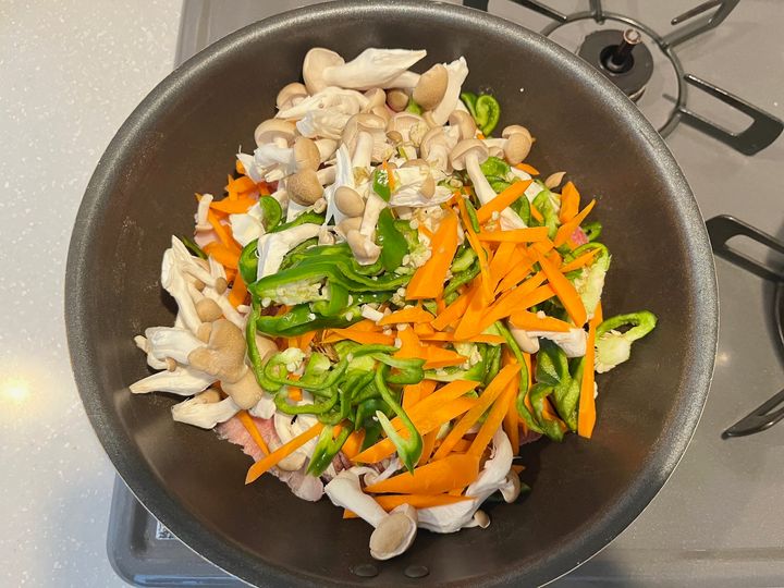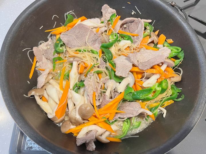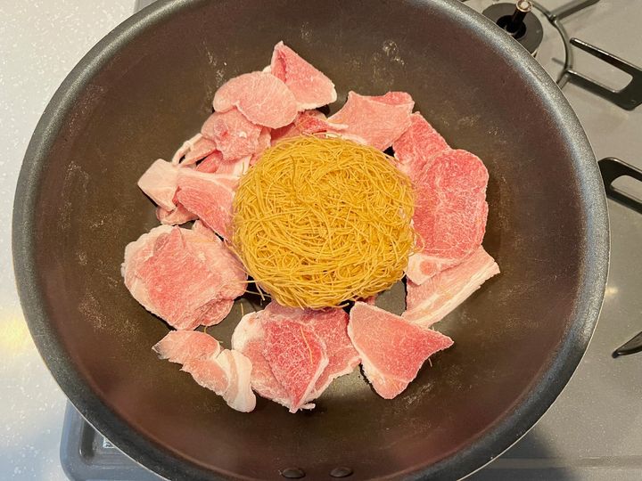 (2)蓋付きのフライパンに肉→ビーフン→野菜の順に重ねる
