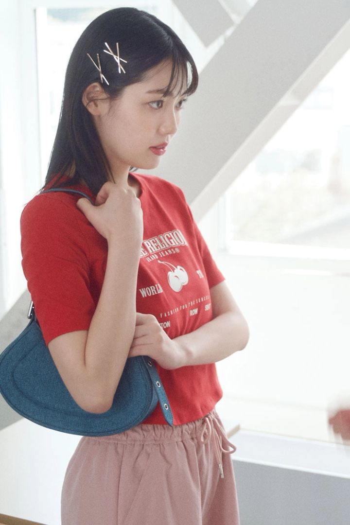 強気な赤ロゴTとあわせて存在感マシマシ♡ デニムバッグやヘアピンで韓国っぽな雰囲気に。