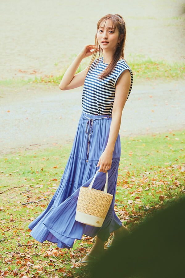 夏らしいブルースカートが主役!リゾートで着るならボーダーを合わせてリラクシーに