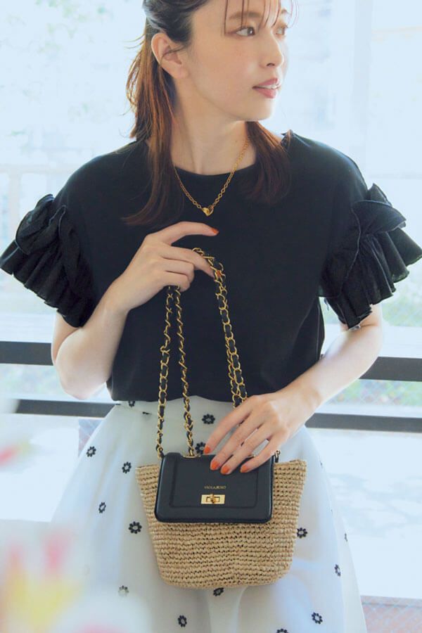 華やかさと季節感を兼ね備えたバッグ。Tシャツコーデのときは、小ぶりなデザインを選ぶと女性的な印象に。