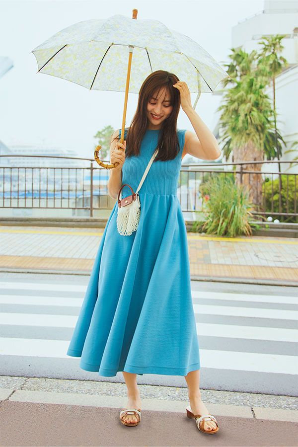 ワンピース¥18,700/アプワイザー・リッシェ ピアス¥4,320/アビステ 傘¥18,700/トラディショナル ウェザーウェア(トラディショナル ウェザーウェア ルミネ有楽町店) バッグ¥16,500/ロンシャン(ロンシャン・ジャパン) 靴¥15,400/ダイアナ(ダイアナ 銀座本店)