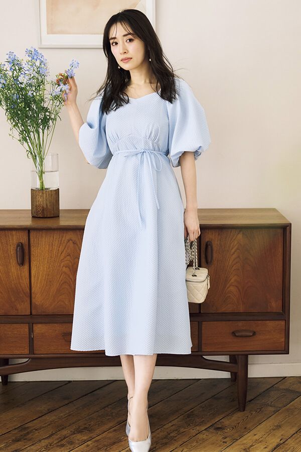 淡い寒色トーンのジャカードを一面に敷いたワンピでクールビューティーに。パフ袖×ウエストリボンで二の腕カバーや脚長効果を狙いつつ、可愛らしさもしっかりIN。
