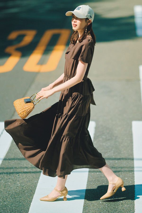 大人なブラウンでリラクシーなティアードをシックで上品な印象に。夏小物の定番・ストローハットを合わせがちなティアードワンピに、エンブレムのロゴが入った旬なキャップを合わせることで、ワンランク上のシャレ感をゲット。