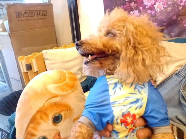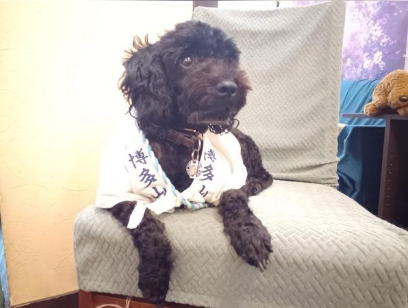 その名の通りくるくるとした毛で可愛らしいですね! この日は山笠の法被を着ていました。これも手作りなんだそうです! まだ3歳で構って遊んでアピールが凄いです♪席に座って膝をポンポンと叩くと乗ってきてくれますよ! その他「お手」や「回れ」なども出来るんです。