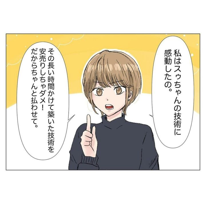 クリエイターや技術職の人の、目に見えない技術や時間の「価値」。それに対して、対価を払うことは、時間をかけて手に入れた技術に対して敬意を払うことでもあります。主人公は今まで、「友達価格」を強要されることで自信を失っていました。プロとしての意識を持つためにも、自分の技術を安売りしなのは大切なことです。